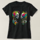 Två stiliserade skallprofiler presenteras mot en vit bakgrund. Varje skalle omges av vibranta, färgstarka blommor och löv, skapande en dekorativ och nästan blommigt andedräkt runt varje huvud. Blommorna är en blandning av fechsia, rosa, orange, gult, teal och andra ljusa färger. Löven och vinerna målas i gröntens nyck och efterliknar en naturlig tillväxt.