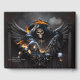 Ben och magi, skelett med den mystiska dice. Skelet är inklämt i en djup svart skaka. Dess beniga hand når ut på ett gigantiskt sätt till en stor, svart dice som mörker och exuderar en aura av det okända. Flamor och rökdans runt figur, skapande en dramatisk och olycksbringande atmosfär. Är skelettet en gammal hemlighet eller en mörk?