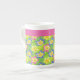 En söt Bone China Mugg som ska anpassa sig, med en mönster av rosa, gult och blå primerer, som har matchat rosa band där du kan lägga till text om du vill, som en del av Posh & Painterly 'Primroses'-samlingen.