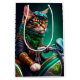 En vän i håriget bakom handlebarna från en grönt som är blankt och som har en grönt Saint patrick's day som gör att huvudena svänger. Katten är klädd i en festlig ensemble, komplett med en grönt och en passande top hat som sitter på sitt fula huvud. Med de invecklade designerna av schampar och leprechaunsar skapar det tydligt att denna katt är redo att fira Saint patrick's day i stil.