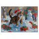 En hjärtvärmande julillustration med en glad katt som leker i snön, iklädd en tomtehatt och omgiven av färgglada presentlådor. I bakgrunden bygger barn en snöman bredvid ett snötäckt julgran, vilket skapar en glädjefull vintervärld. Perfekt för att sprida julstämning och fånga julens magi.