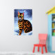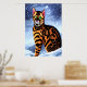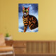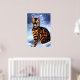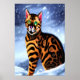 En bengalkatt i färg orangen och svart med gult öga och grönt öga, i snöberget på natten. Det här är en AI-skapad konst.