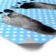 Svarta bebisfotspår på blå och vit prickig bakgrund för Baby Shower spel.