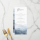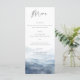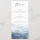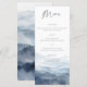 Denna bröllopsmeny kort har en akvarell bergslandskap i dammig blå. Designad för bergsbröllop, nationalpark ceremonier, och rustika utomhusfiranden, estetiken fokuserar på en naturlig och organisk naturtema.