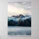Landskapsfoto av berg med dimma precis före solnedgång.