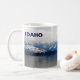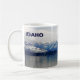 En digital målning av berg med tak över snö på Sjö Pend Oreilles kuster (dammoray) i Sandpoint, Idaho, på en sen vinterdag. Även texten "IDAHO" finns med.
