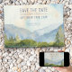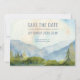 Kort för berg-bröllop spara datum med scenisk vattenfärgsdesign i skuggor av dammig blått och grönt. De otillgängliga områdena är bergsområden, grönområden och gräs träd, sjö och ett lätt himlar. Texten är redigerbar och om du vill matcha produkter bläddrar du i min samling av Mountain Sjö.