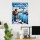 Den här fängslande målningen fångar ett ögonblick av tyst övervägande mellan en tålig Sasquatch och en liten hjort. Sasquatch, med en cowboyhatt och överdrag, står på en snö-täckt utgröda som drar hjorten i hans arm medan man tittar på en picturesque sjö omgiven av berg. Himmel är en klar blått med mjuka moln, och den tjocka, texturerade impaston ökar målningens uttryckliga karaktär. Den tysta frasen "Bigfoot tror inte heller på dig" står i himmel och lägger till en liten bit humor till scenen.