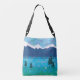 Bergsområden sjöar, gräs träd och snötoppar axelväska
