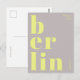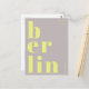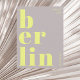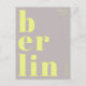 Skicka en snyggt hälsning från Berlin Tyskland med detta moderna typografiska vykort. Utformningen har ord Berlin uppdelat på tre linjer i fet, dekorativ gemener brev, i stark gult på grått-bakgrund. Ovanför är uttrycket hallo aus (hälsning från) skrivet i ett slimmat, tunt sans serif-teckensnitt, som lägger till en subtil, modern beröring. Perfekt som semesterkeepy, dekorativ accent eller att skicka hem från din favoritstad. En minimalistisk men ändå öga-fångstdesign för älskare av contemporary-estetik och resememementon.