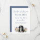 Bröllop spara datum-kort med Bernese Mountain hund design. Grått-blå text, i handskrivet skript och i typsnitt, med fet stil. Minimalistisk vit papper med hund och jokerblommor vid grund. Reverse är grått-blått i fast form.