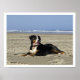 Fotografi av en Bernese Mountain-hund med sandstrand.