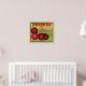 Vintage frukt, låda, etikett från Washington för röda äpplen. Ett kluster av äpplen i förgrunden och ett sol stigning över bergen och odlingarna i bakgrunden.