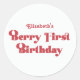 Lägg till en "berry" söt beröring till firande med den här Anpassningsbarna Berry First Birthday Round Sticker! Med ditt barns namn och Berry First Birthday i charmering av jordgubbsröda bokstäver, klipper den här klistermärket på och av rent - perfekt för förslutning av kuvert, favoritpåsar, Mason burk, party décor med mera. Det är en mångsidig keepé som gör att land-chic får flluft i varje detalj.