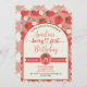 Berry First Birthday Scallop-inbjudan. Med röda jordgubbar med rosa bakgrund. Perfekt för dina flickor 1:a födelsedag firande! Koordinerar även inbjudningar, tecken och dekor.