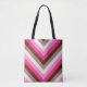 Bilden har en slående schevron mönster som består av fet, färglöst rand som pekar nedåt i en "V"-form. Dessa rand upprepas i ett rytmiskt mode och växlar mellan rik, vibrerande färg: måndag, magenta, orange, gult och oliv grönt. Den övergripande visuella effekten är både retro och energi, vilket framkallar en lekfull men strukturerad estetisk påminnelse om 1970-talets designtrender.