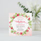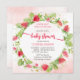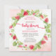 Mall för inbjudan att duscha jordgubbsbebisen, vattenfärgsjordgubbskran, ljus rosa bakgrund.