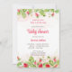 Mall för inbjudan till babybabydusch med berry sött jordgubbar, jordgubbar med blomning, grönsak, ljus rosa bakgrund.