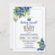 Söta och summerade inbjudningar till blåbär, pick-tema för babyduschning. Med vackra blåbär och blommor i vattenfärg med ett klassiskt baby blue och vitt, kontrollerat "täckblad" av bord på motsatt sida.