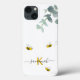 En vit chic bakgrund. Dekorerad med vattenfärgad eukalyptus greenery, foliage och söt, lycklig leende humla. Anpassa och lägg till ditt monogram brev, initial och namn. Namn är skrivet med ett modernt handskript i stil med dekorationer. Namn i svart och monogram brev i gult. Om du bara vill behålla utslagen tar du bort exemplet namn lämnar du blankstegen eller symbolerna framför och efter namn.