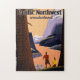Poster visa en man och en kvinna som tittar ut över bergen och en stad vid vatten, bland rödved träd.