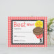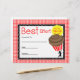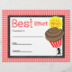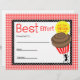 Ett belöningscertifikat för bästa möjliga ansträngning från student som visar en bild av en stor chokladkaka med rött och vitt pappert och som ger ett pris överst. Bakgrunden är röd gingham. Svart trim med vit polka dots.