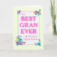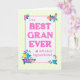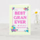 Ett söt Mors dag-kort för BÄSTA GRAN EVER. Utformningen har en gult som kontrollerar gingham gräns runt ord, "To the BEST GRAN EVER with Lots of Hugs and Kisses", i magenta rosa med text på en lätt texturerad vit bakgrund. Det finns starka kluster av blommor med flera färgader i hörnen och ett litet rosa i magentan. Det inre meddelandet kan anpassas eller tas bort om du vill.