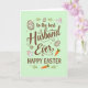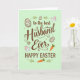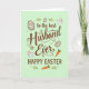 This greeting card features a pale mint-green background that feels like early spring, with a centered message reading “to the best Husband Ever HAPPY EASTER.” The words “Husband Ever” sit in the middle in a smooth, flowing brown lettering style, while “to the best” appears smaller above and “HAPPY EASTER” sits below in a simple, thicker brown type. Around the text, decorated egg shapes in soft teal and white show zigzags and stripes, adding a gentle holiday touch. Two long-eared rabbits 🐇 with fluffy pink tails are shown mid-leap, angled toward each other in a way that suggests closeness and shared excitement. Bright orange carrots with leafy green tops and a few olive-green sprigs 🌷 fill the open space, giving the layout a cozy, homey garden feel. Small golden starburst accents dot the design like tiny glints of light. The eggs and greenery cluster near the sides, with the rabbits and carrots arranged around the center so the brown lettering remains easy to read.