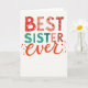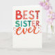 This greeting card features the message “BEST SISTER ever” on a white background, and it feels like a big, happy shout of love ❤️. “BEST” sits across the top in large letters, with a red “B” covered in white and yellow polka dots, pink “E” and “S” with tiny multicolor dots, and a red “T” filled with teal diagonal stripes and small yellow accents. Right below it, “SISTER” appears in teal letters sprinkled with bright little spots, and you can notice tiny extra markings tucked inside parts of the letters if you look closely. Near the bottom, the word “ever” is written in smooth orange cursive-style lettering that curves gently across the lower area. Small red dots and a few star shapes are scattered around the words, adding a cheerful finish without taking attention away from the message. The mix of colors and patterns makes the card feel lively, but the message stays clear and sweet. It’s a meaningful card to give when you want your sister to feel appreciated, seen, and truly loved 🥰.