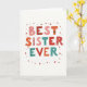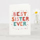 This greeting card features the words “BEST SISTER EVER” centered on a white background, with each letter drawn in a different color and pattern. The text looks like hand-drawn print lettering, and it’s filled with stripes, dots, stars, and tiny details that make the phrase feel lively and caring. The “B” in “BEST” is pastel pink with small stars, and the “E” beside it is red with green polka dots. Other letters switch between orange, teal, and red, including a teal “E” that even has a tiny green chili pepper tucked into the design. Around the main words, small red hearts and little red dots are scattered like confetti, framing the message without distracting from it ❤️. It feels meaningful because it says something simple and direct, while the varied letters show extra thought and attention—like you really want her to feel appreciated. It’s an easy way to share love and closeness with a sister who feels like a best friend 🥰, and it’s perfect for sharing Valentine’s Day sentiments.