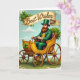 This St. Patrick's Day card features a dapper, almost storybook gentleman in an emerald suit and matching top hat, with a sunny yellow waistcoat and a fiery red beard that stands out against the sky. He holds the reins with a steady, gentle grip, as if guiding someone special along for the ride, and the scene feels friendly and close without anyone needing to say a word 💚. Beside him sits an ornate golden-yellow carriage with classic spoked wheels resting on a rich green patch of grass, its deep red cushioned interior adding a cozy touch. A four-leaf clover emblem decorates the carriage, surrounded by clusters of shamrocks that curl around the edges like a leafy frame ☘️. Across the top, a warm cream banner stretches overhead, carrying the words “Best Wishes” in dark lettering centered neatly on the ribbon. Behind everything, the background is a calm blue sky with soft, billowy clouds drifting past. The shamrocks and a larger four-leaf clover gather around the banner and carriage, with bright highlights catching the polished metal and the folds of the green suit.