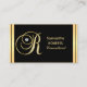 Föreställ sig yourself väl med dessa eleganta/flott monogrammed visitkortar. Topografibrev/märka med sina initialer "R" i guld med svart bakgrund. Liten diamant för Faux i mittet. Redigerbara mallar - tillfoga precis din text; Förnamn-, efternamn-, titel-, affärsnamn-, telefonnummer-, adress-, website- och e-postadress. Kontaktformgivare för mer guld- brev. 'Samling för MONOGRAMMED VISITKORTAR"