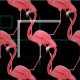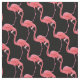 Tyg som visas i ett tropiskt rosa flamingotryck på en svart bakgrundsfärg.