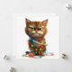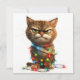 Visar en bestämd tabbykatt mitt i julkaos, insvept i ljusa, färgglada ljus. Ett vykort till alla som någonsin har känt sig överväldigad under semestern!
