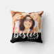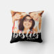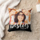 Moderna besties fotot dekorativ kudde med namn. Ersätt fotot med eget och ändra texten. Foto och text på framsidan och baksidan av kudden. Gör en underbar presentidé. Vit typografi på svart bakgrund.
