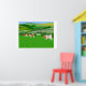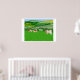 Illustration av tre bruna och vita kor som betar i grönt fält med hänsyn till ängar och landskap i avstånd. Bild finns tillgänglig på olika presenter och produkter.