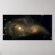 Två galaxer från spiral passerar i konsten Canis Major som stora fraktaser på natten. Den nära kollisionen har fångats i bilder av NASA:s "Hubble Space Telescope" och dess "Wide Fält planetskamera 2". Den större och mer omfattande galaxen är listat som NGC 2207 (på den lämnat bilden av det brittiska kulturarvet), och den mindre på högerna är IC 2163. Starka tidvattenkrafter från NGC 2207 har förvrängt formen av IC 2163 och flingat ut stjärnor och gas i långsamma strömlinjeformare som sträcker ut hundra tusen ljusår mot bildens höger kant. Datorsimuleringar som utförs av ett team som leds av Bruce och Debra Elmegreen visar den lagliga tidsskalan för galaktiska kollisioner. Förutom Hubble bilder visar mätningar som gjorts med National Science Foundation's Väldigt Large Array Radio Telescope i New mexico rörelse på galaxerna och bidrar till återuppbyggnaden av kollisionen. Beräkningarna visar att IC 2163 svänger förbi NGC 2207 i motsols riktning efter att ha gjort sin närmaste strategi för 40 miljoner år sedan. IC 2163 har dock inte tillräckligt med energi för att kunna ta sig ur NGC 2207:s gravitationsdragningskraft och är tänkt att dras tillbaka och svänga förbi den större galaxen igen i framtiden. Den höga upplösningen i Hubble telescope-bilden avslöjar dammköer i spiral-armen av NGC 2207, som tydligt silhuverteras mot IC 2163, som finns i bakgrunden. Hubble visar också en serie parallella stoftfibrer som sträcker sig som brans penseldrag längs det tidvatten som sträcks ut på högerna. De stora koncentrationerna av gas och stoft i båda galaxerna kan mycket väl bryta ut i regioner med aktiv stjärnbildning inom den närmaste framtiden. Dessa två galaxer, som fångas i sin ömsesidiga omloppsbana runt varandra, kommer att fortsätta att förvränga och störa varandra. Så småningom, miljarder år från och med nu, kommer de att samlas i en enda, mer massiv galaxi. Man tror att många dagens galaxer, inklusive Milky Way, har samlats från en liknande processaa av koalescens av mindre galaxer som uppträder under flera miljarder år. Bilden skapades från tre olika punkter i Hubble. Datauppsättningarna i den stora planetkameran 2 har hämtats från Debra Meloy Elmegreen (Vassar College), Bruce G. Elmegreen (IBM Research Division), Michele Kaufman (Ohio State U.), Elias Brinks (Universidad de Guanajuato, Mexiko), Curt Struck (Iowa State Universiteten), Magnus Thomasson (Onsala Space) Obs., Sverige), Maria Sundin (Goteborg Universiteten, Sverige) och Mario Klaric (Columbia, South Carolina).