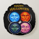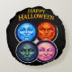 Elevate your spooky decor with this happy Halloween elemental round cushion the striking accessory brings together for mystical moon faces the serene blue the fiery orange, the enigmatic green and the playful winking pink each representing a different elemental spirit set against a deep black background with bold vintage style Halloween lettering this plush pillow is the perfect way to add comfort and a hint of dark fantasy to your sofa reading nook or be whether you're celebrating Sawin or just love the Gothic aesthetic this high-quality throw pillow offers a