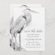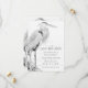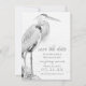 Det här Save the Date-meddelandet från bröllop innehåller en pennskiss stil teckning av en vacker Underbar blå Heron som står på sten och bortser från vatten. -