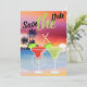 Den här vackra bröllop spara datum-konstruktionen har en vacker strandscen med en vibrerande solnedgång över havet. Det finns två Margaritas med korsade strån framför bakgrunden, vilket inkluderar charmering av handflatan träd silhouettes. Anpassa enkelt med all din information.