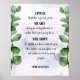 Decorativt bibelcitat med mjuka löv på blå vattenfärgsbakgrund och handskrivet teckensnitt.