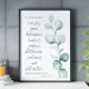 Decorativ bibelcitat med löv på vit bakgrund och handskrivet teckensnitt. Observera: ram på befordringsbilden ingår inte.