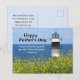 Anpassningsbarnas inspirationstecken, Fars dag-vykort, visar ett svart och vitt fyr med söt gula blommor och en blå havs- och himlar-bakgrund. Baksidan har Bible Verse Romans 15:13, "May the God of Hope fyller dig med all glädje och fred."~
