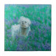 Dekorativ keramisk ruta tryckt med en färglös illustration av en Bichon Frisé i en fält av blåmotorredskap. Bild: Färg-penna på panelen. Copyright: Dominic White. Alla höger reserverade.