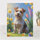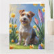 En glad hund sitter fridfullt på frodig grön gräsmatta, omgiven av färggranna vårblommor under en mjuk blå himmel. Denna digitala oljemålning fångar ett lugnt ögonblick med uttrycksfulla penseldrag, varma färger och en känsla av mild glädje.