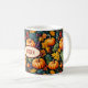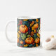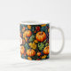 Stora och små pumpor, grönt och guld lämnar, och spola lila druvor förenar sig till ett vackert Thanksgiving på mugg. Snygg skördebild för ditt hem!
