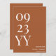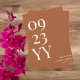 Gör ett påstående som inte kan ignoreras med Big Bold Terracotta Spara datumet. Den här utformningen kräver uppmärksamhet och upphetsning med ett stort och fetstilt vitt datum mot en fängslande terracotta-bakgrund. Ange tonen för det kommande bröllop på ett slående och oförglömligt sätt. Se till att ditt bröllop-datum är märkt med entusiasm. Välj Big Bold Terracotta Spara datumet och skapa ett djärvt påstående som anger scenen för ditt oförglömliga firande.