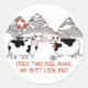 Humoriserade tecknader står i en alpregion där man ställer denna laddade fråga i Alpernorna med en schweizisk flagga som blåser i bakgrunden.