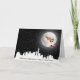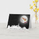 Stjärnor i svart himlar med tomten i ett sleigh med renar, gåvor och en glödande fullt som flyger över en stor vit skylt. Text kan ändras eller tas bort.