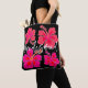 Bridesmaid-gåva till väskan. Storblommor av hibiscus i svart rosa är ett mönster på båda sidor. Texten "Bridesmaid" är i stort, vitt skript som täcker designens mittpunkt. Ordalydelsen och bilder är desamma på båda sidor.